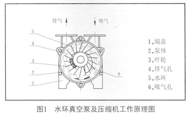 如圖1所示,葉輪3偏心地安裝在泵體2內,因此當葉輪3旋轉時,水受(shòu)離心力的作用而在泵體內壁形成(chéng)一旋轉水環5,水環上部內表而(ér)與輪(lún)轂相切沿箭頭方(fāng)向旋轉,在前半轉過程中,水環內表麵逐漸與輪轂脫(tuō)離,因此在葉輪葉片間與(yǔ)水環形成封閉空問,隨著葉輪的旋轉(zhuǎn),該空間逐漸擴大,空間氣體壓(yā)力降低.氣體被吸入空(kōng)間:在後半轉過程中, 水環內(nèi)表麵漸漸與輪轂禹靠近,葉片間的空間逐漸縮小,空間氣體壓力升高(gāo),高(gāo)於排氣口壓力時(shí),葉片間的氣體被(bèi)排出(chū), 如此葉輪每轉動一(yī)周,葉片間的(de)空間吸排一次,許多空間不停(tíng)地工(gōng)作,泵就連續不斷地抽吸或壓送氣體。